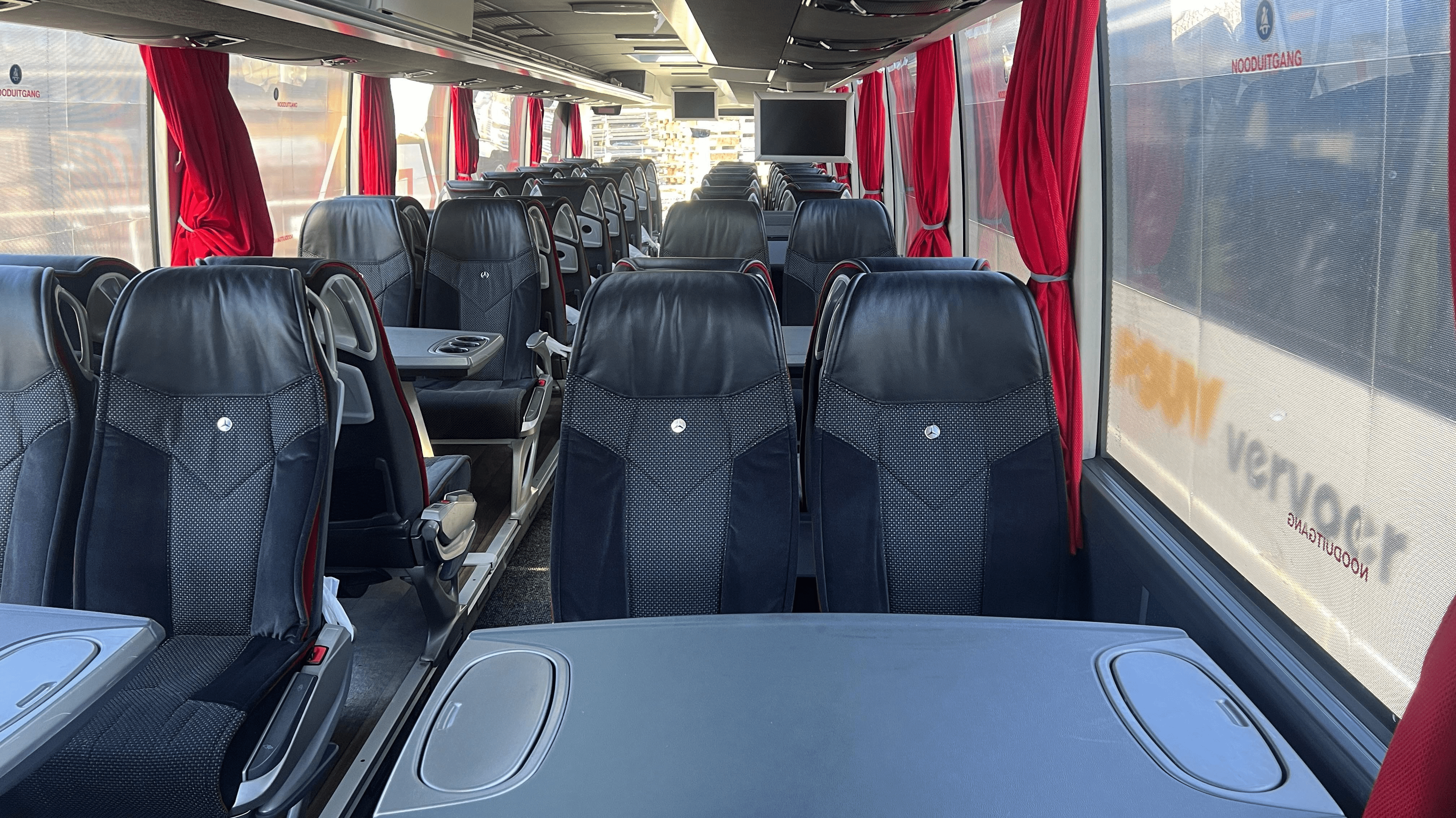 De spelersbus is voorzien van alle denkbare luxe. Denk aan verstelbare stoelen, meerdere tafels, een grote rondzit achterin, een keuken, koelkasten en drie flatscreen tv-schermen. Zo reis je niet alleen comfortabel, maar ook in stijl – net als de profs.